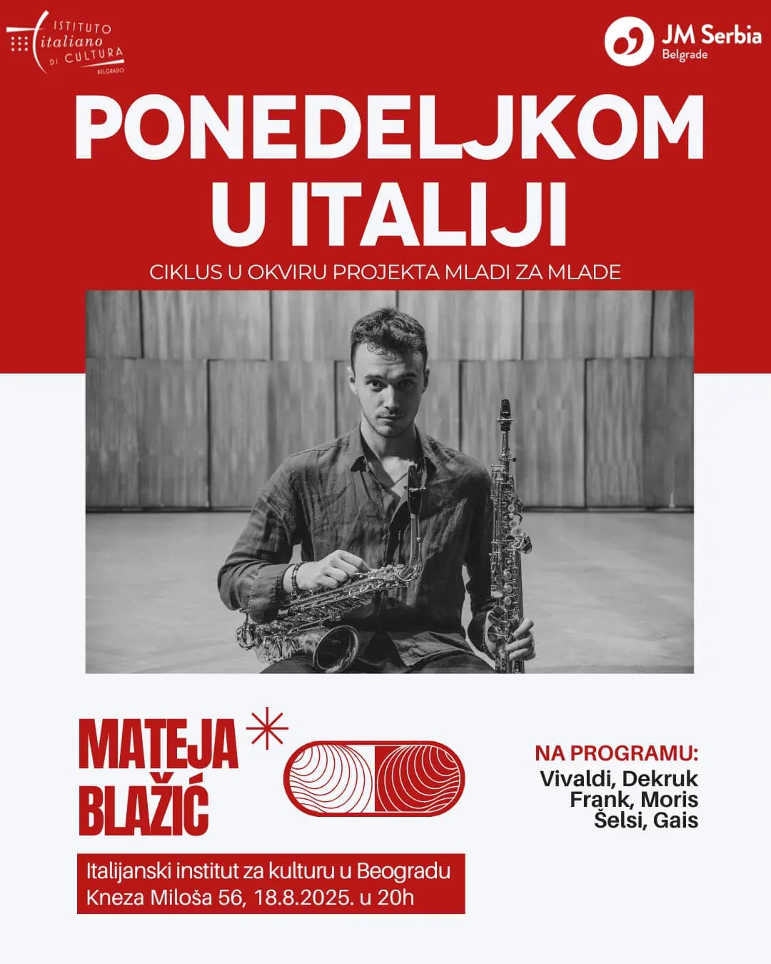 🎶✨ We are delighted to invite you to another concert from the “Mondays in Italy” series, organized in collaboration with the Italian Cultural Institute in Belgrade! 🇮🇹🎷 This time, the audience will enjoy a performance by saxophonist Mateja Blažić! The…