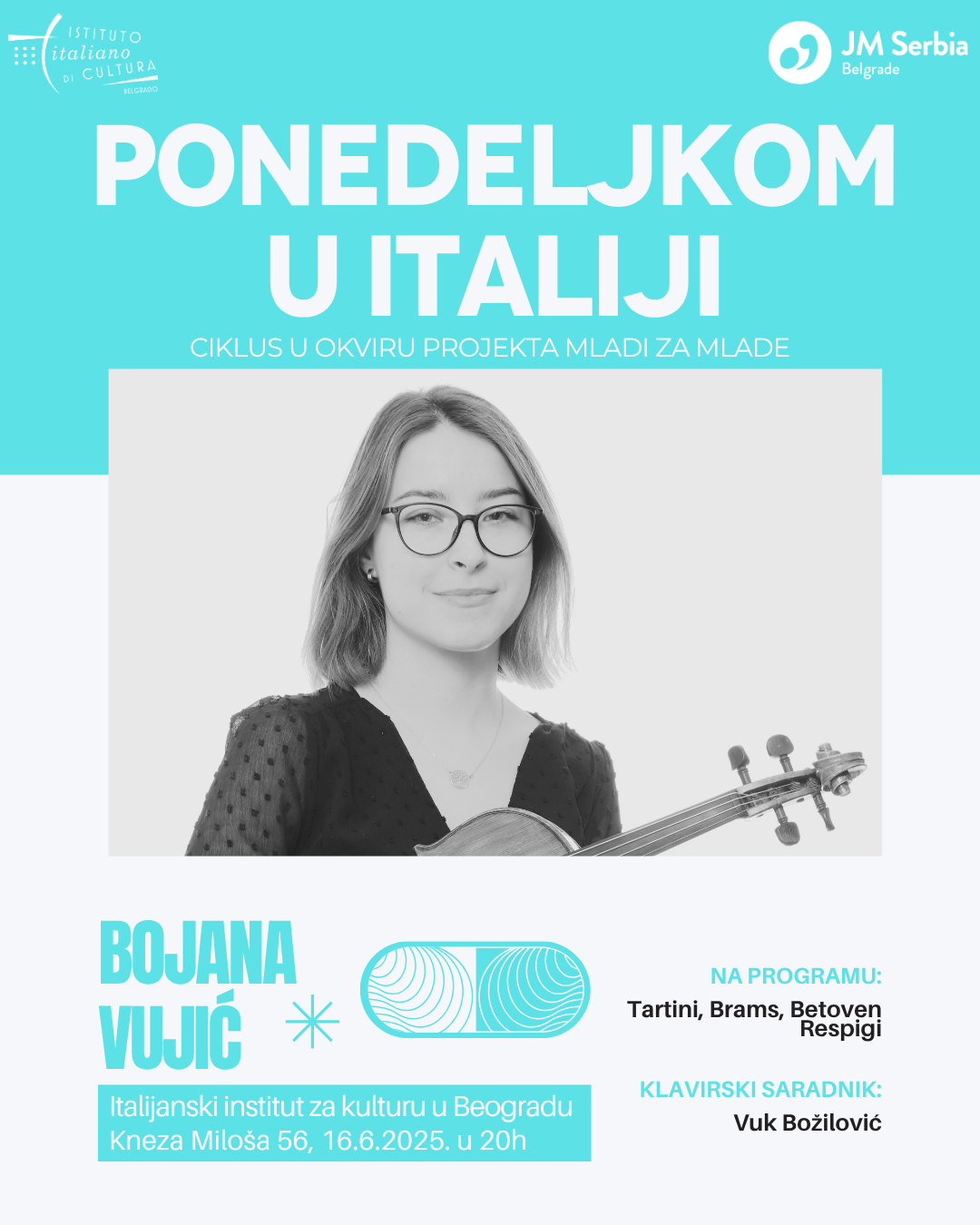🎶🎻 Dragi prijatelji muzike, pozivamo vas u ponedeljak, 16. juna u 20 časova na koncert iz ciklusa Ponedeljkom u Italiji, u saradnji sa Italijanskim institutom za kulturu! 🇮🇹✨ 🎼 Nastupa:🎻 Bojana Vujić – violina🎹 Klavirski saradnik: Vuk Božilović 📜 Na…