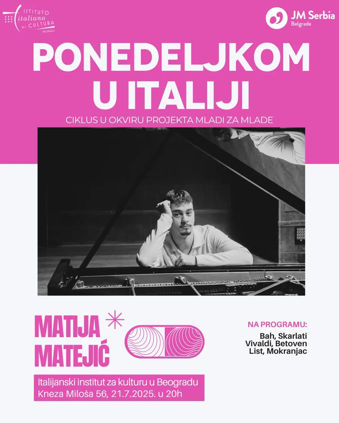 🎶✨ Sa velikim zadovoljstvom vas pozivamo na novi koncert iz ciklusa „Ponedeljkom u Italiji“! 🎹 Ovog puta nastupa mladi pijanista Matija Matejić, koji će izvesti dela kompozitora: Baha, Skarlatija, Vivaldija, Betovena, Lista i Mokranjca. 🎼🎵 📅 21. jul 2025.⏰ 20:00…